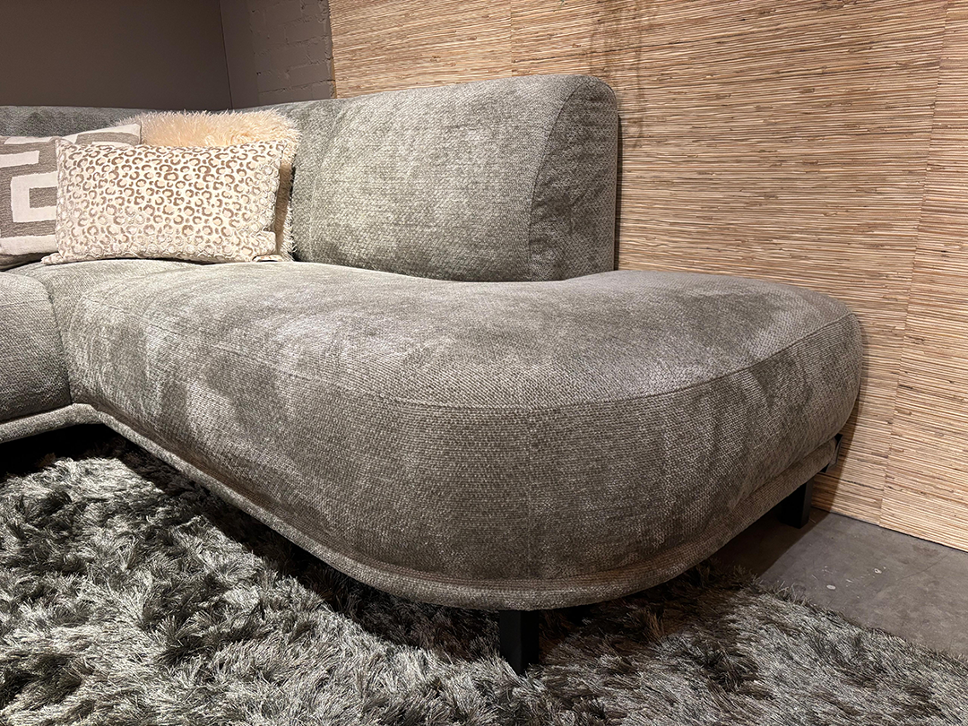 Let op: De prijs van deze bank betreft de prijs van de opstelling en het materiaal zoals het showroommodel: een 3-zits bank met een armleuning aan de linkerzijde en een ronde ottomane met een armleuning aan de rechterzijde in de stof Movie Thyme. In totaal heeft de bank een afmeting van 298×224 cm.