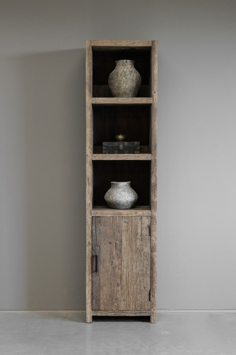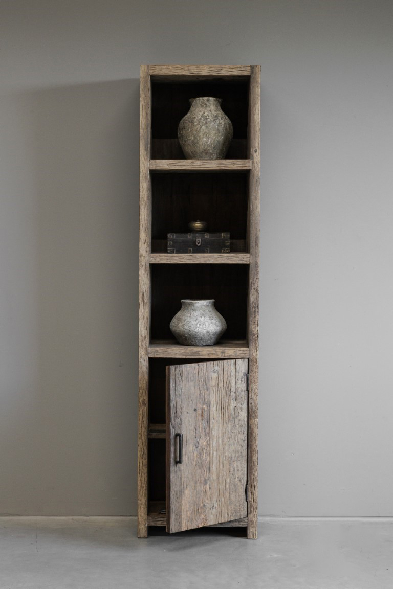 Een stoere, robuuste vakkenkast met extra opbergruimte. Deze kast van primitief oud railway hout is voorzien van een 3 vakken en 1 deur. Perfect om jouw decoratie in te zetten of als boekenkast. Met een maat van 50x36x200 cm is deze kast een echte eye-catcher in de ruimte.