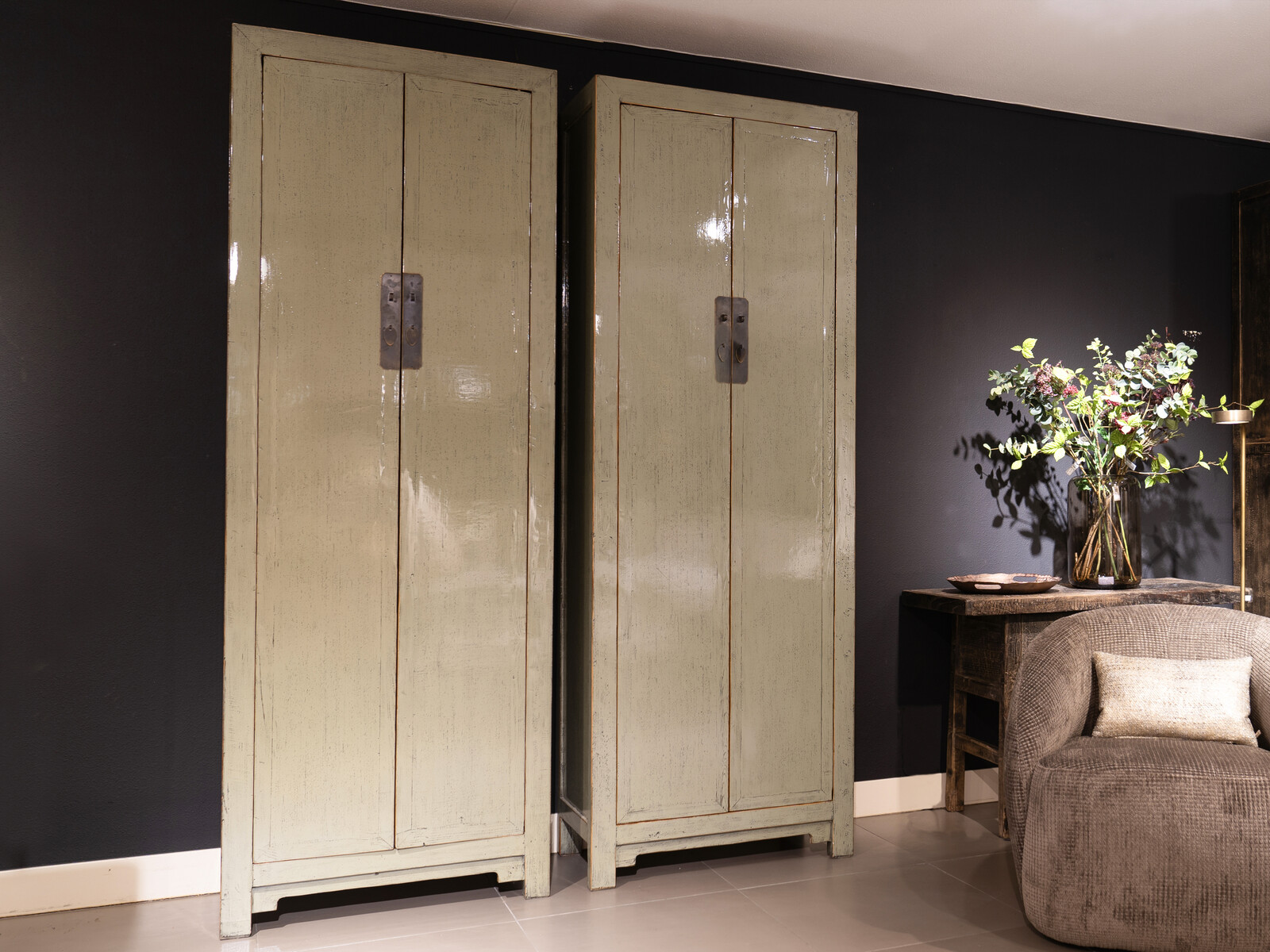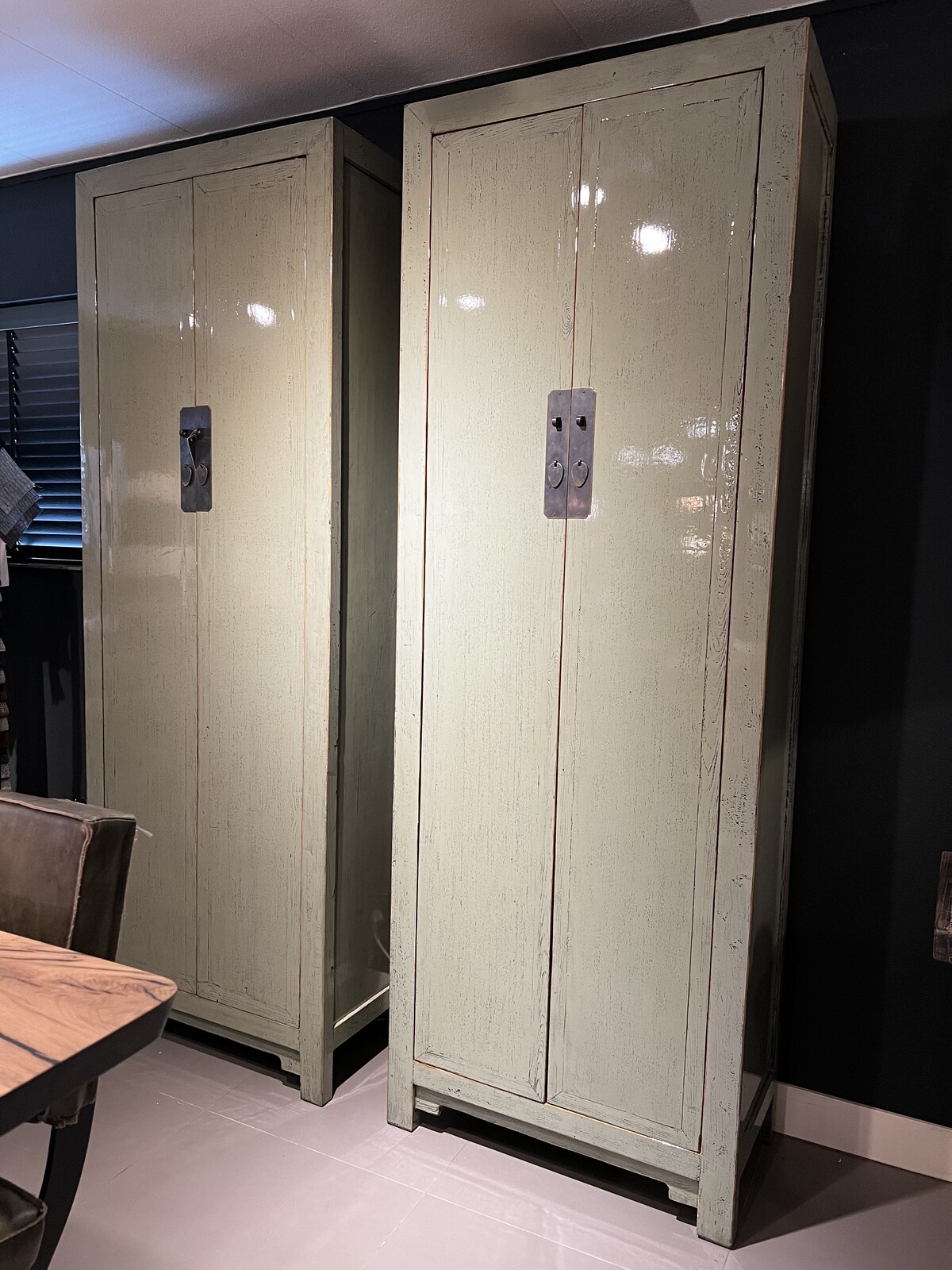 Deze groene wandkast is een prachtig meubelstuk. Met zijn simpele oriëntaalse uitstraling is deze kast een unieke verschijning. Deze kast is een echte eyecatcher door de opvallende groene Jade kleur en de hoogte van 2.25 meter.