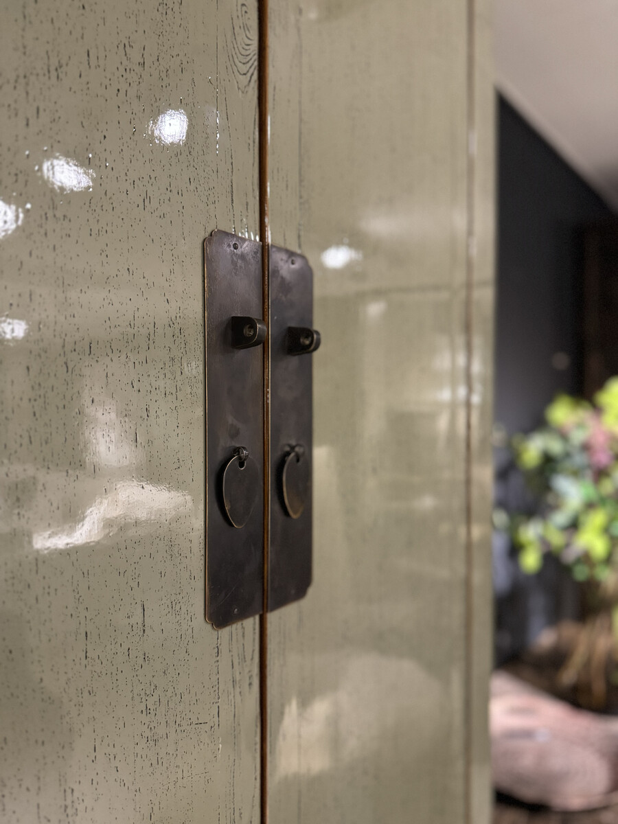 De smalle 2 deurs kast is een meubel met een Aziatische uitstraling voor in bijvoorbeeld jouw woonkamer of slaapkamer. De prachtige details, zoals de unieke kleur, de grote deuren met opvallend beslag en kleine laadjes aan de binnenzijde, zorgen ervoor dat je uren naar deze kast kunt kijken. De kast is voorzien van een metaal beslag en een warme bruine binnenkant. Het meubel is artisanaal met de hand vervaardigd.